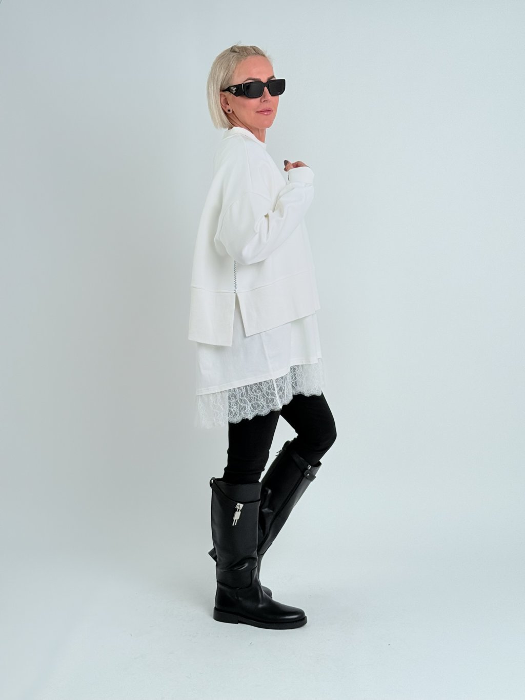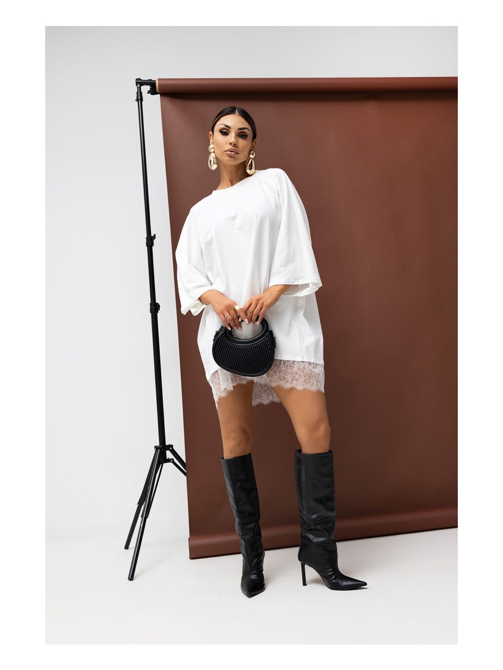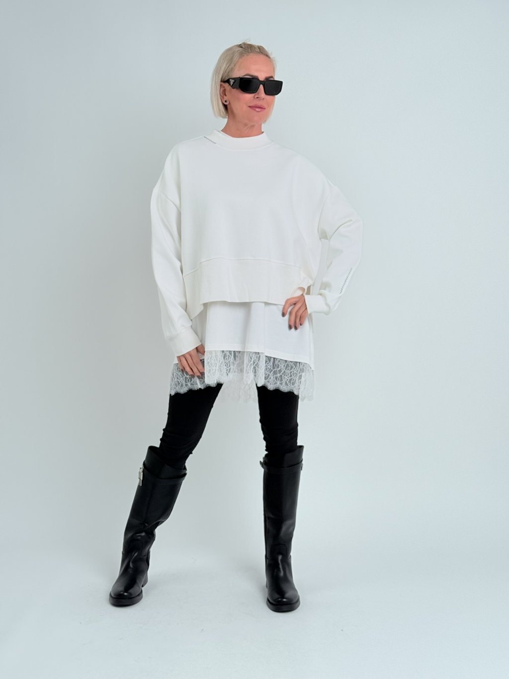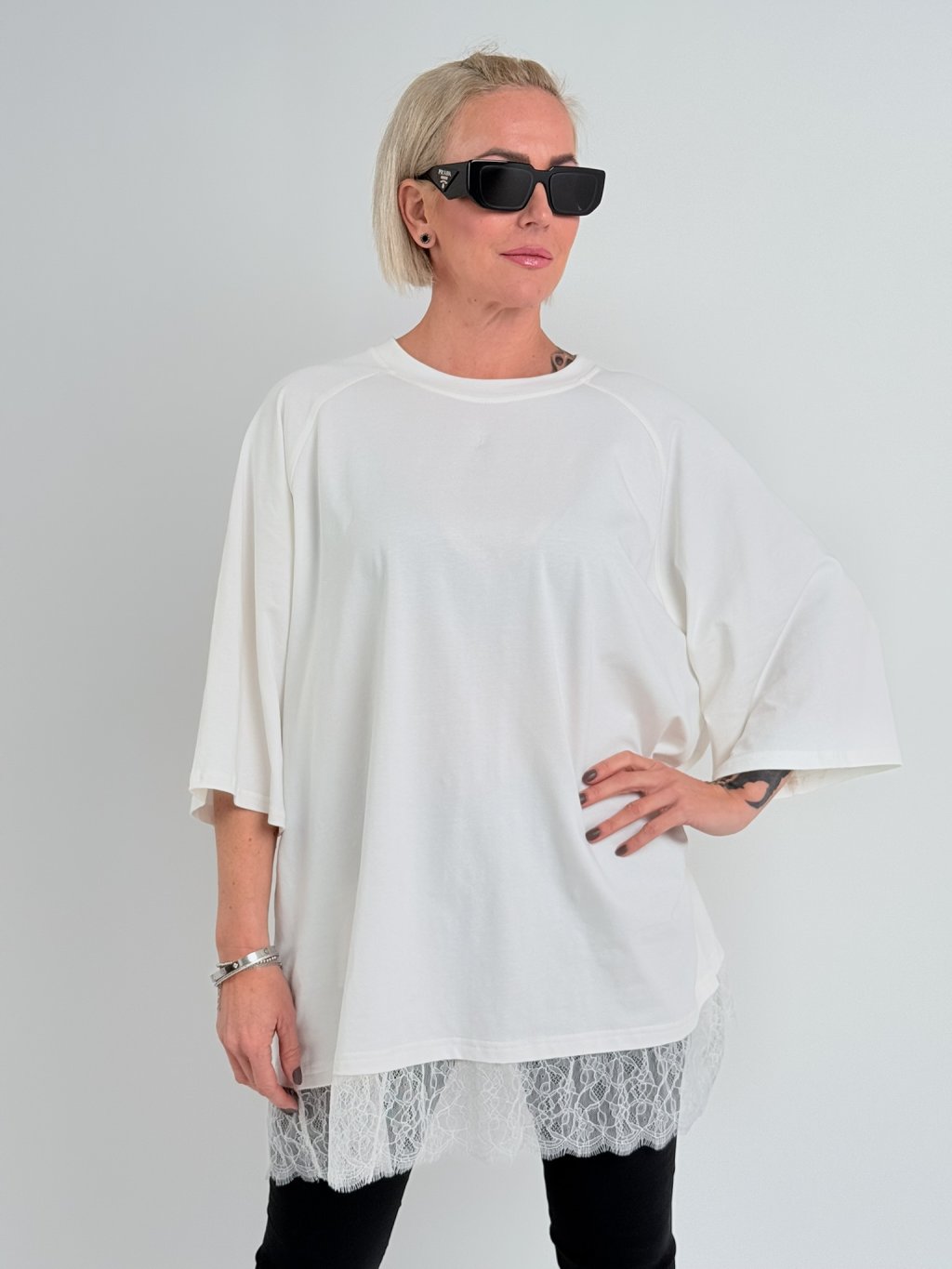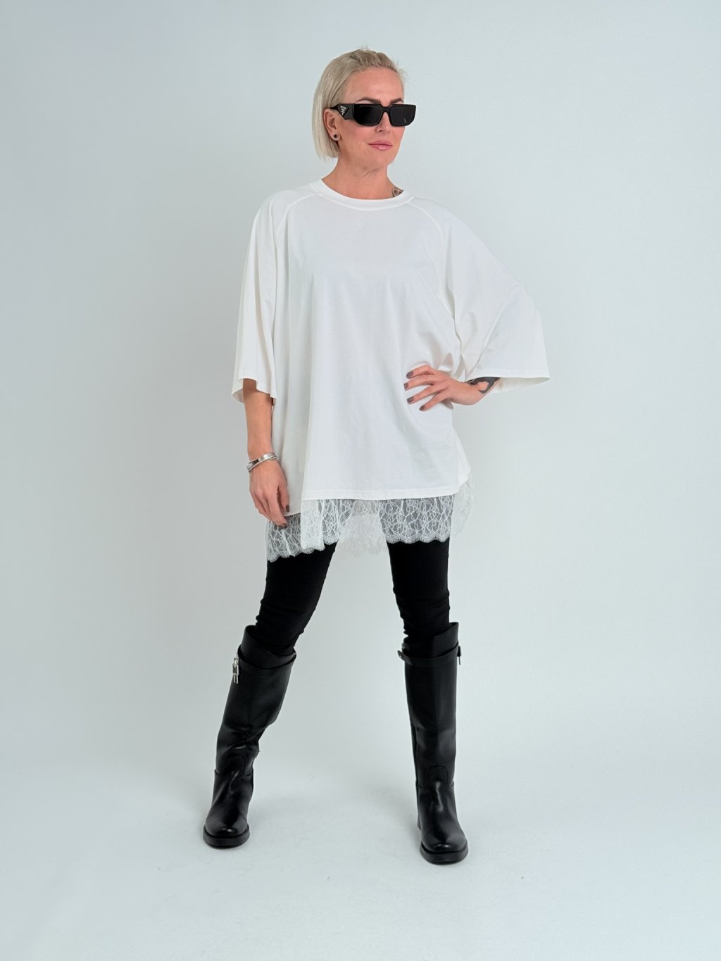 Super, oversize, delší triko s kulatým výstřihem, rukávem k lokti a krajkou i dolního lemu.