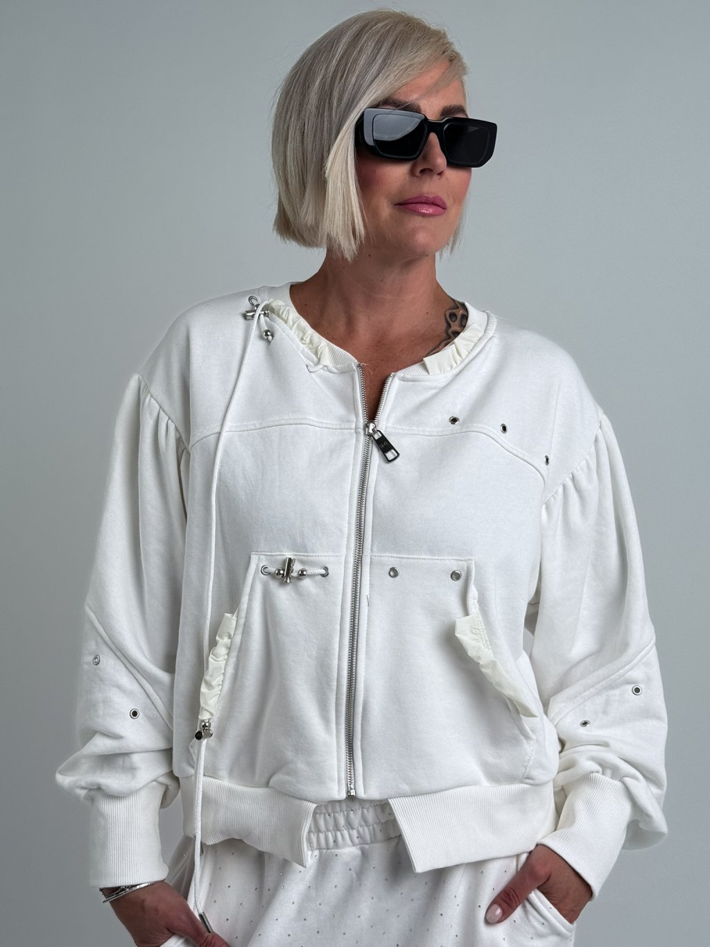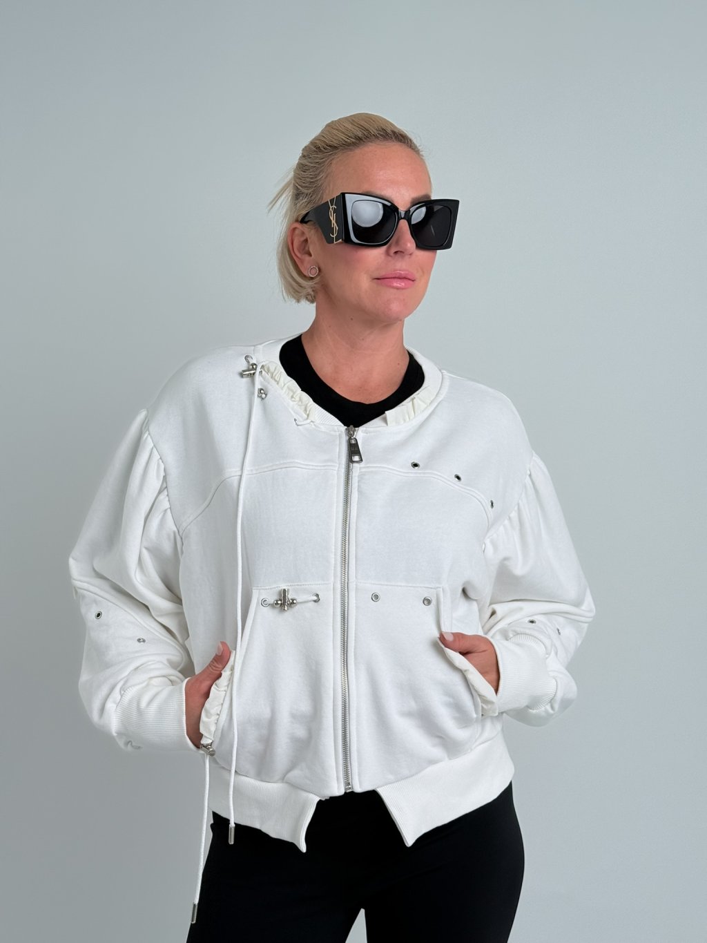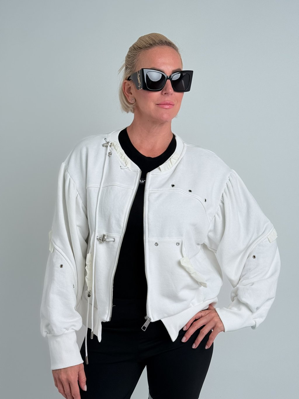 Super, mikinový bomber s nápletem u krku, na rukávech a v pase. Opět, stejně jako mikiny a teplákové kahoty z této kolekce, je i tento bomber ozvláštněn tkaničkami s brzdami . MĚŘTE, BOMBERY JSOU VĚTŠÍ!!!!