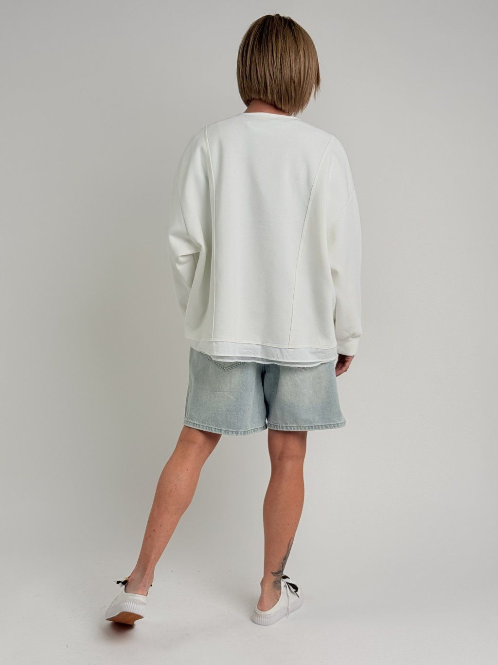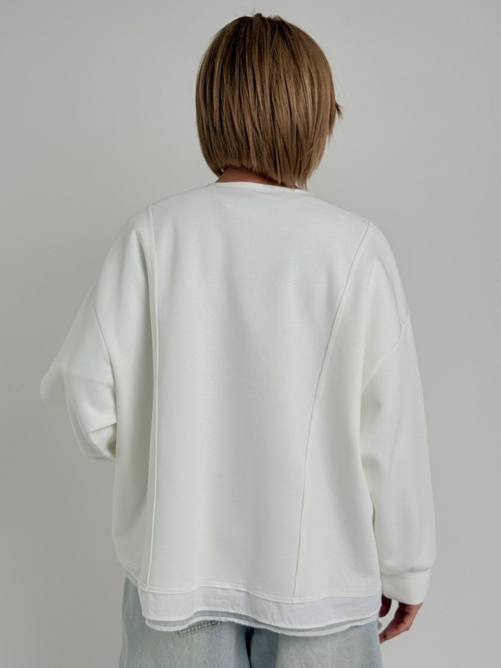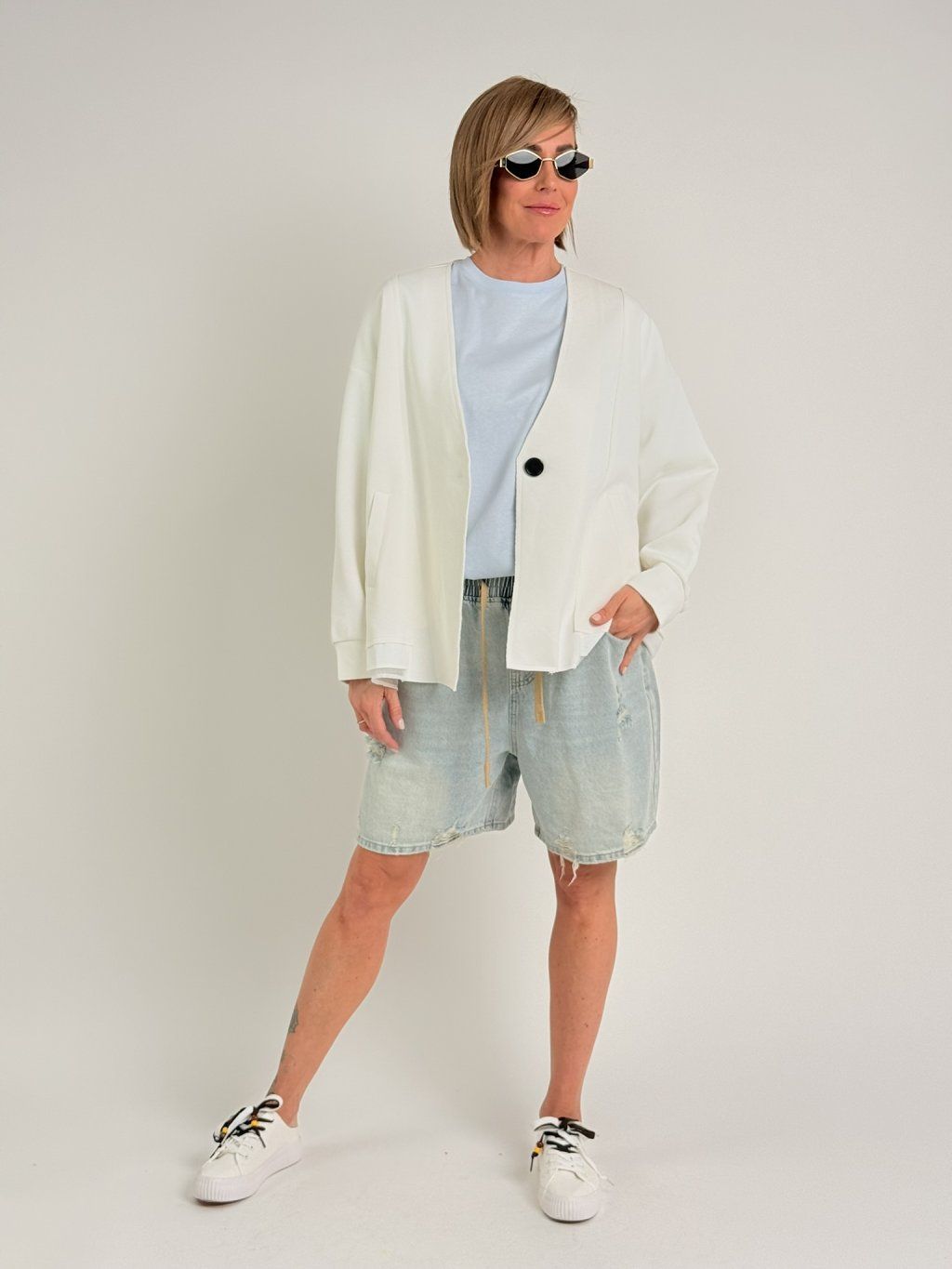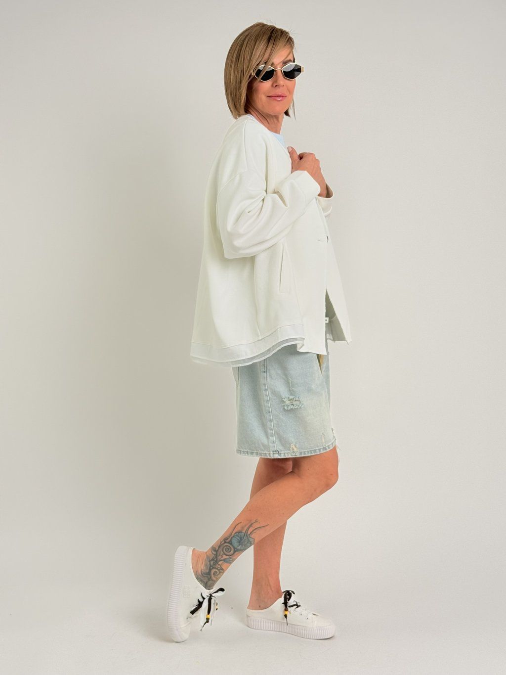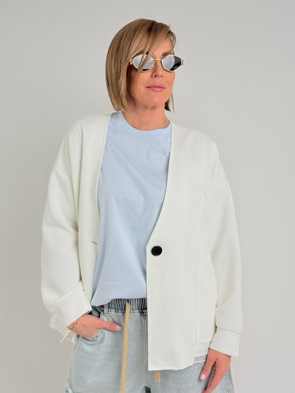 Super kabátek nebo sáčko z pevnější teplákoviny, bez podšívky, s výstřihem do V, zapínáním na 1 knoflík, dolní kraj je lemován šifonem.