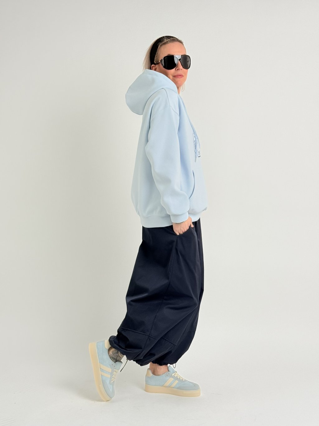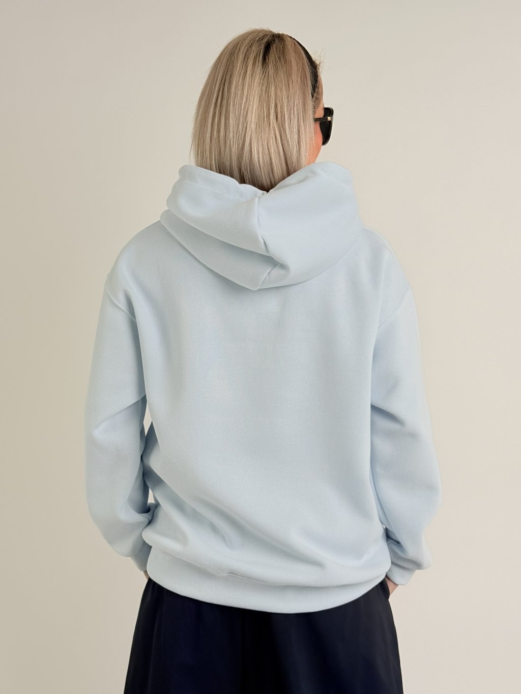 Volnější mikina s klokaní kapsou, kapucí a potiskem na předním dílu.