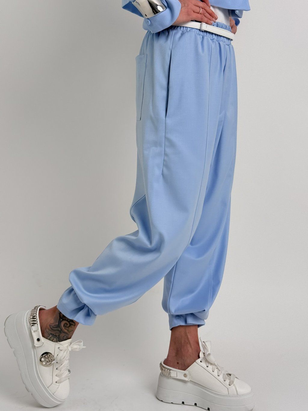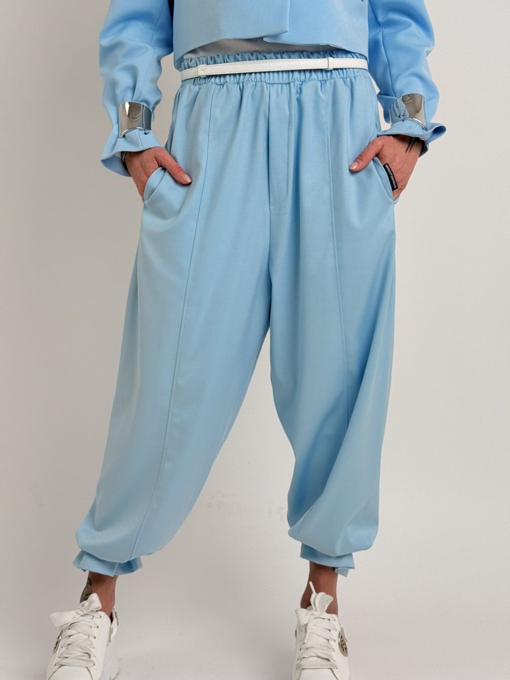 Skvělé, jednoduché, širší kalhoty se sníženým sedem, v pase do gumy, se sámky a postranními kapsami.