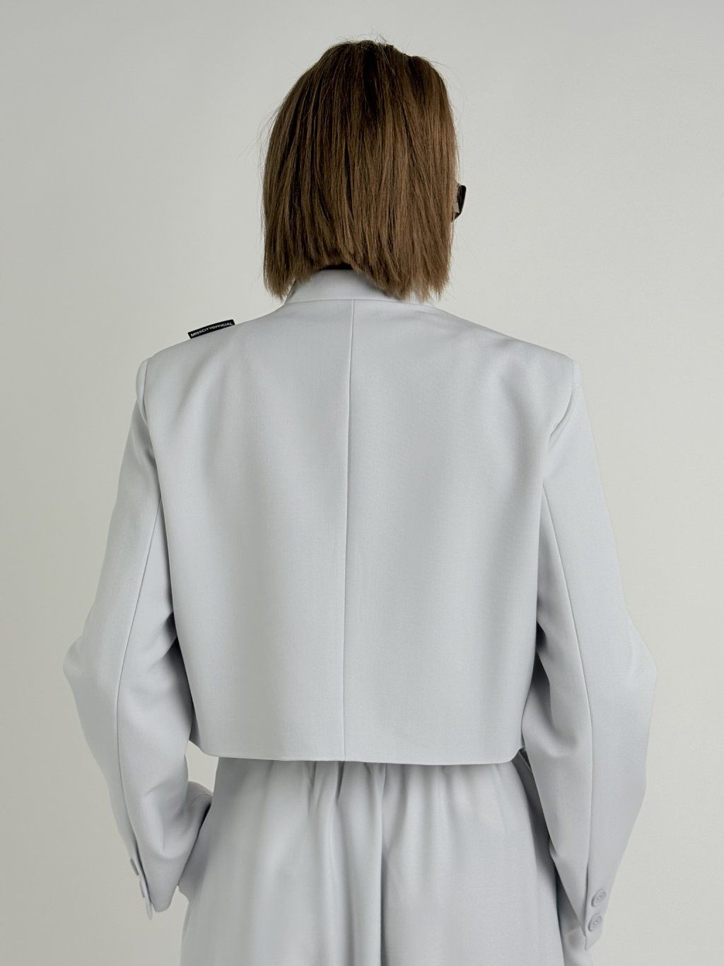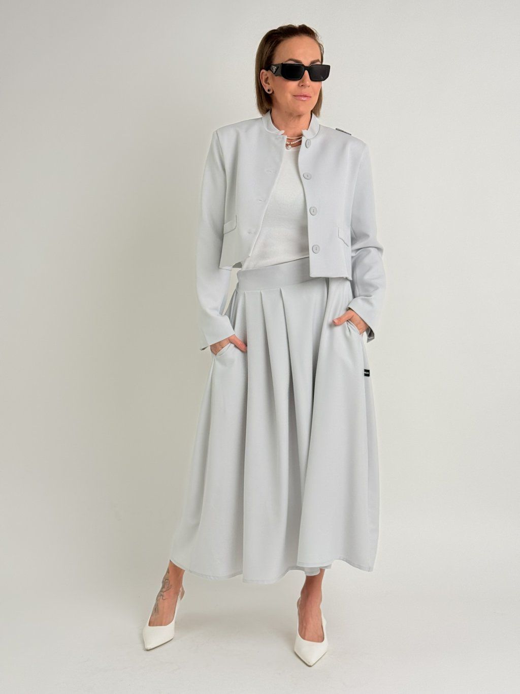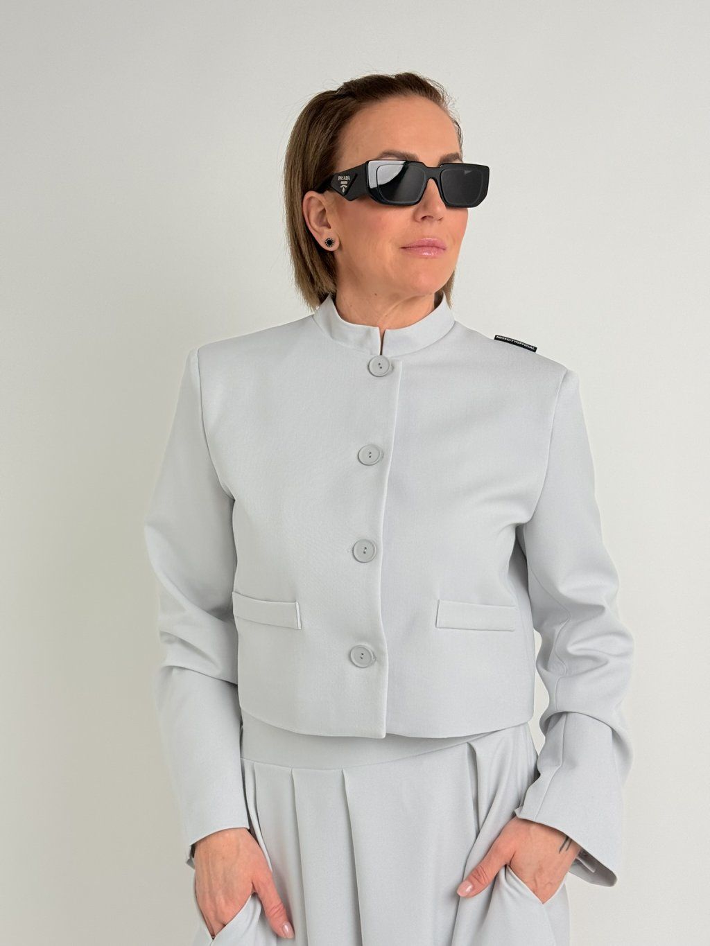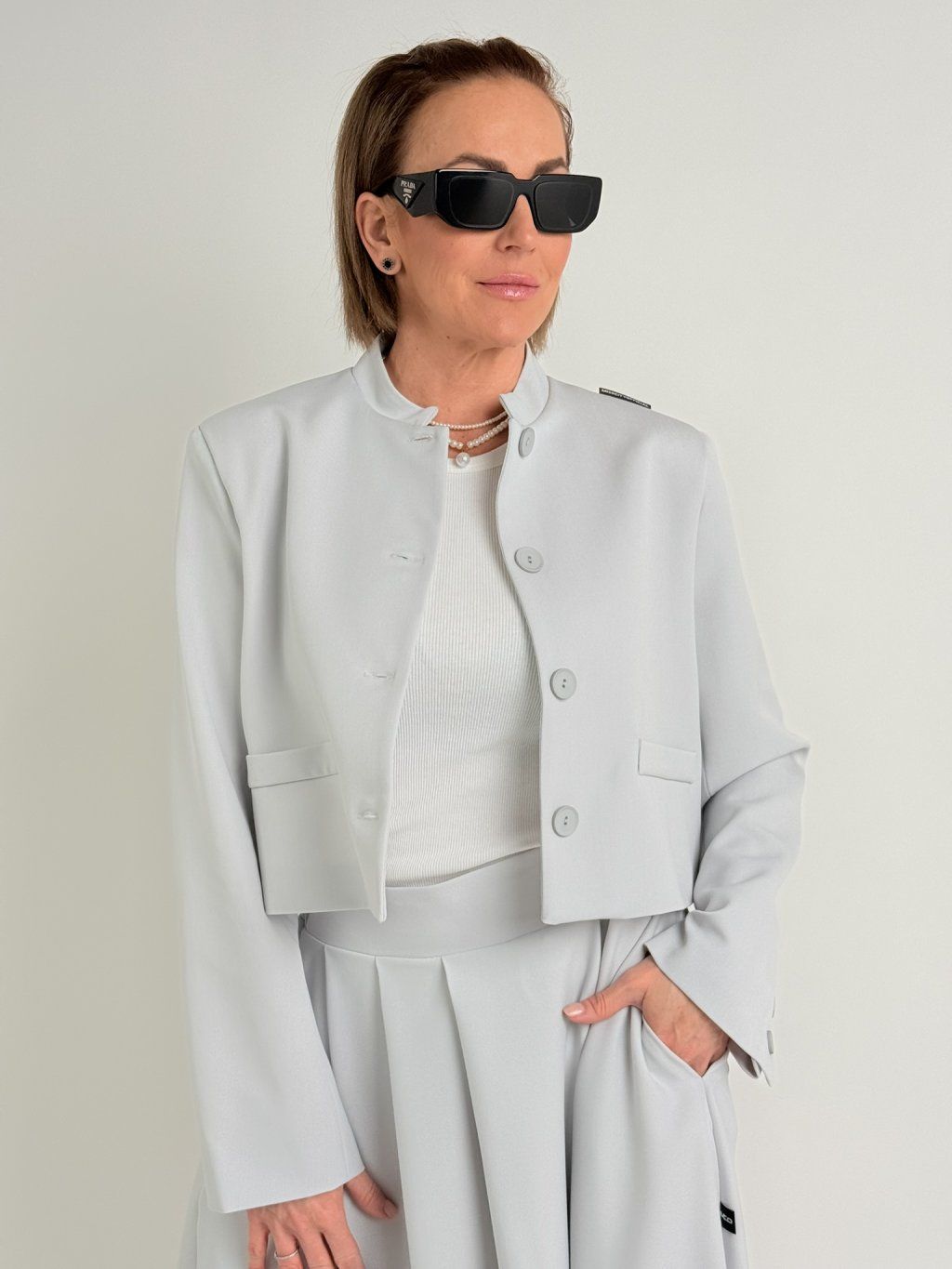 Luxusní, kratší sako s malým stojáčkem, se zapínáním na knoflíky, vpředu s falešnými kapsami a ramenními vycpávkami.