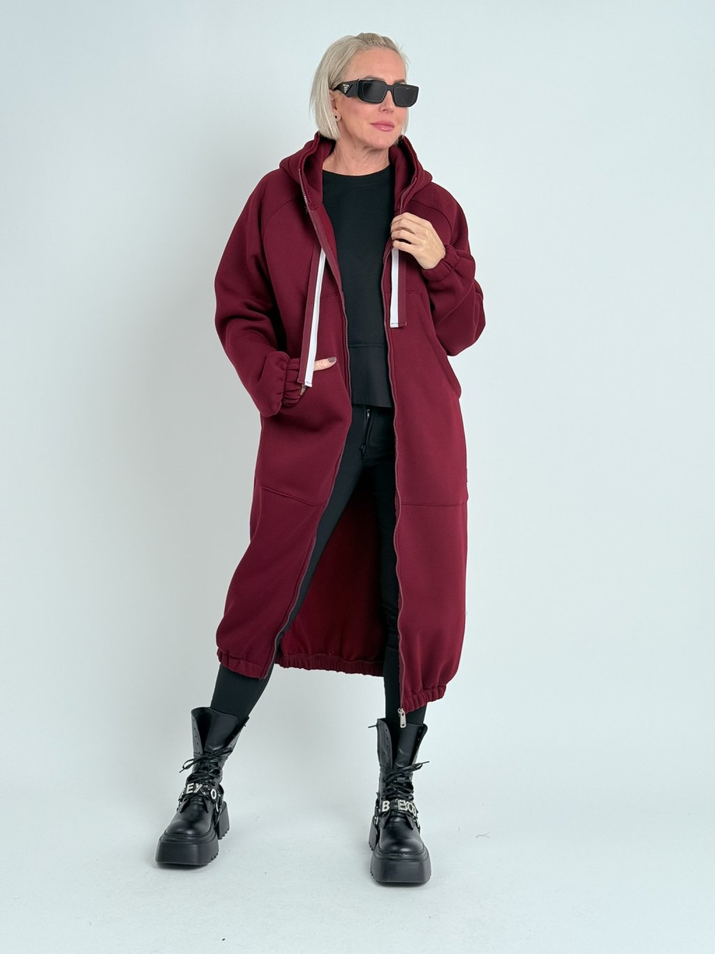 Skvělý, oversize, teplákový kardigan s kapucí, velkou klokankou na předním dílu a zapínáním na zip. Rukávy i dolní lem jsou zakončeny gumou
