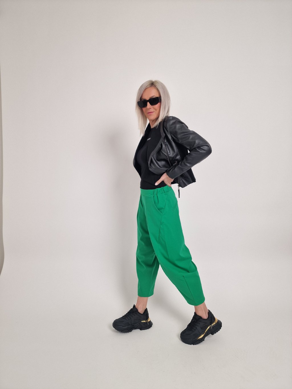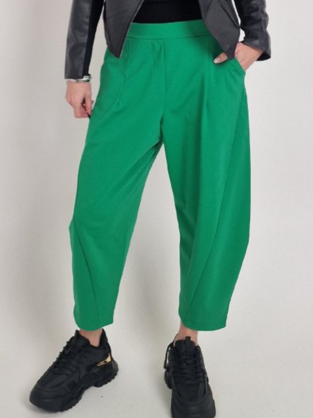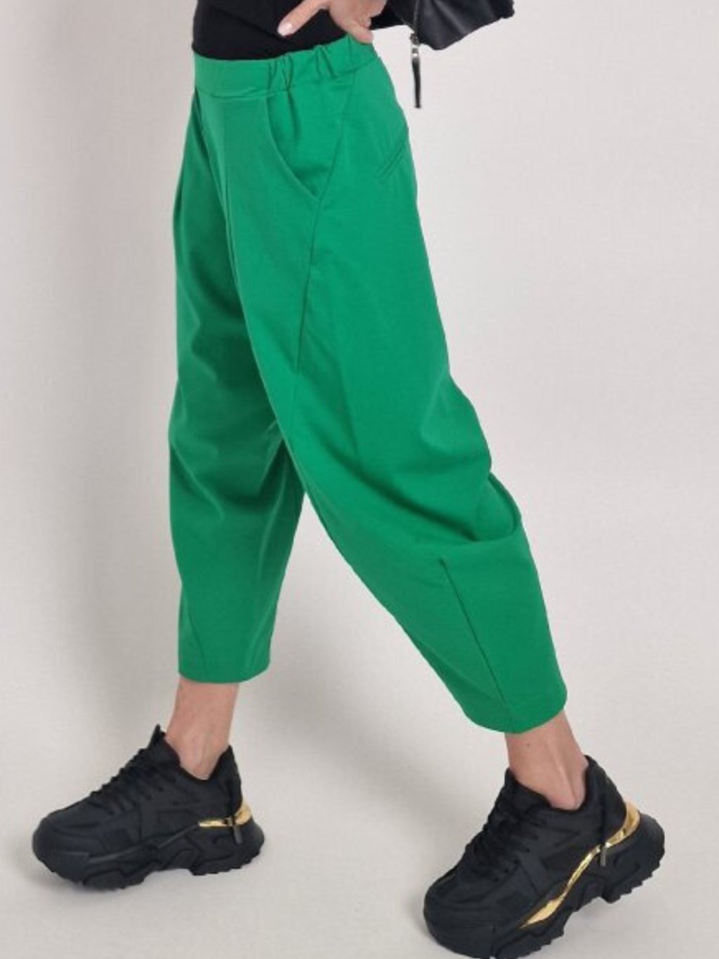Luxusní kalhoty s gumou v pase, širšími nohavicemi v horní části, dolu se zužujícími. Super střih i materiál.