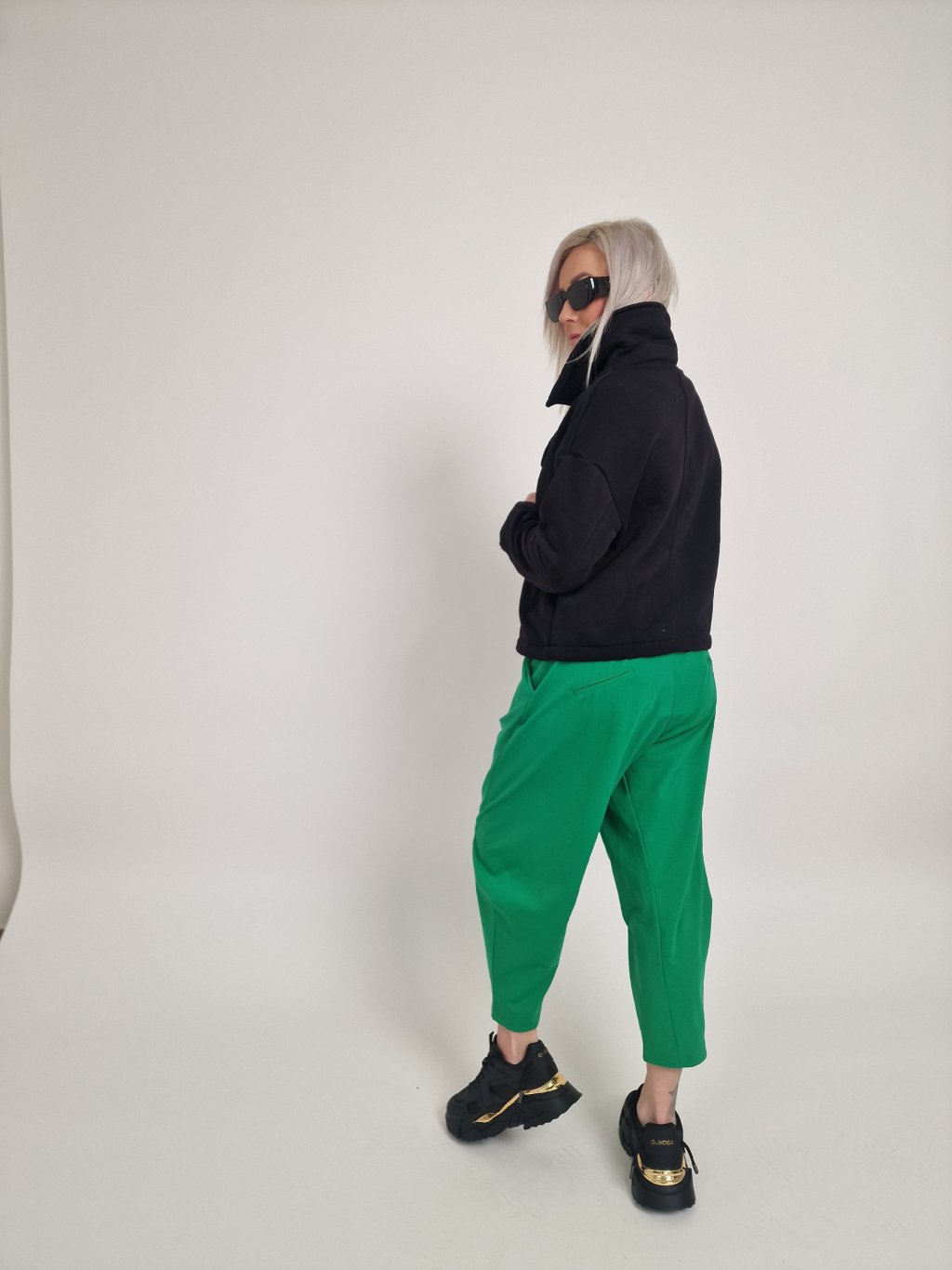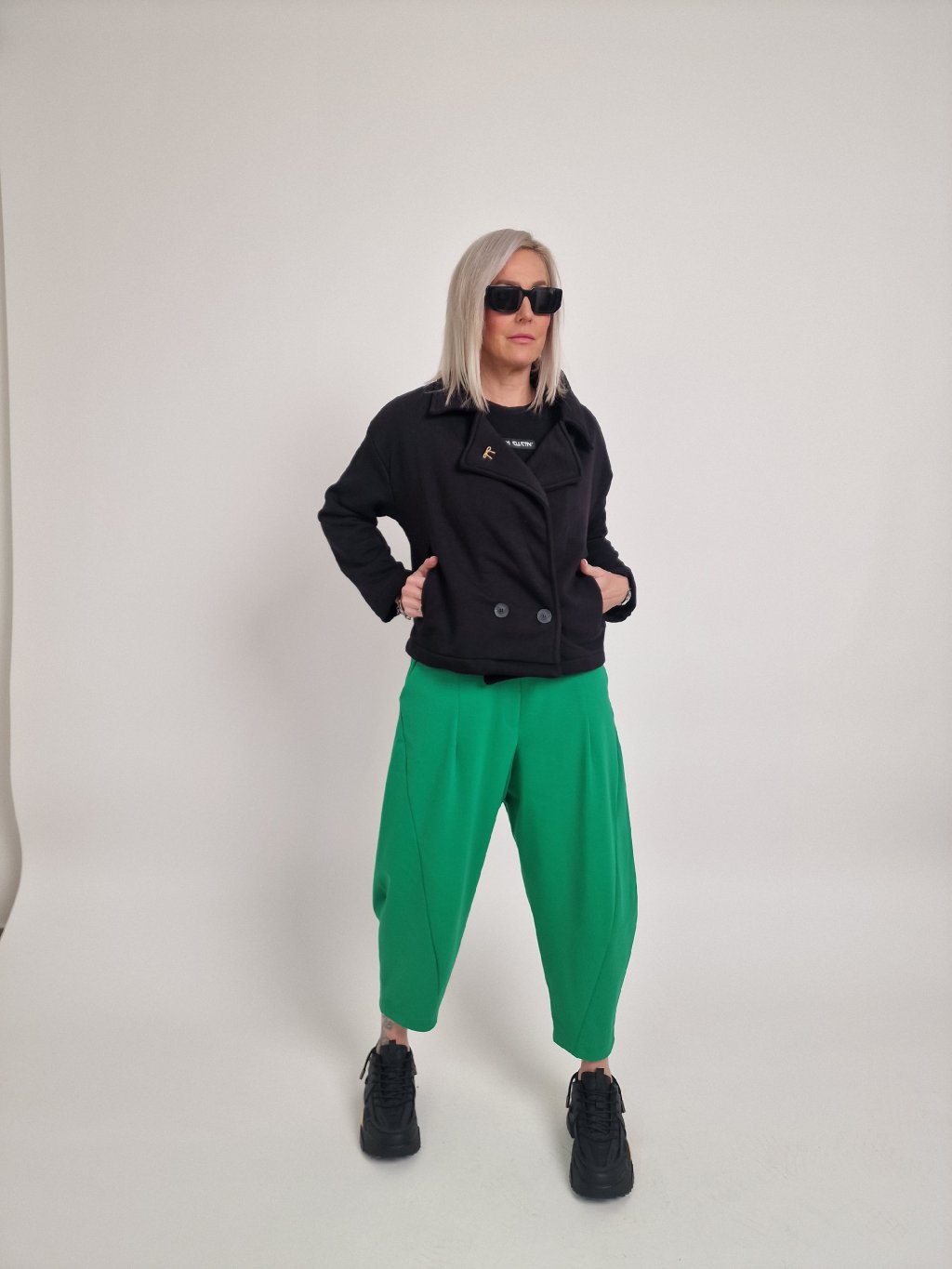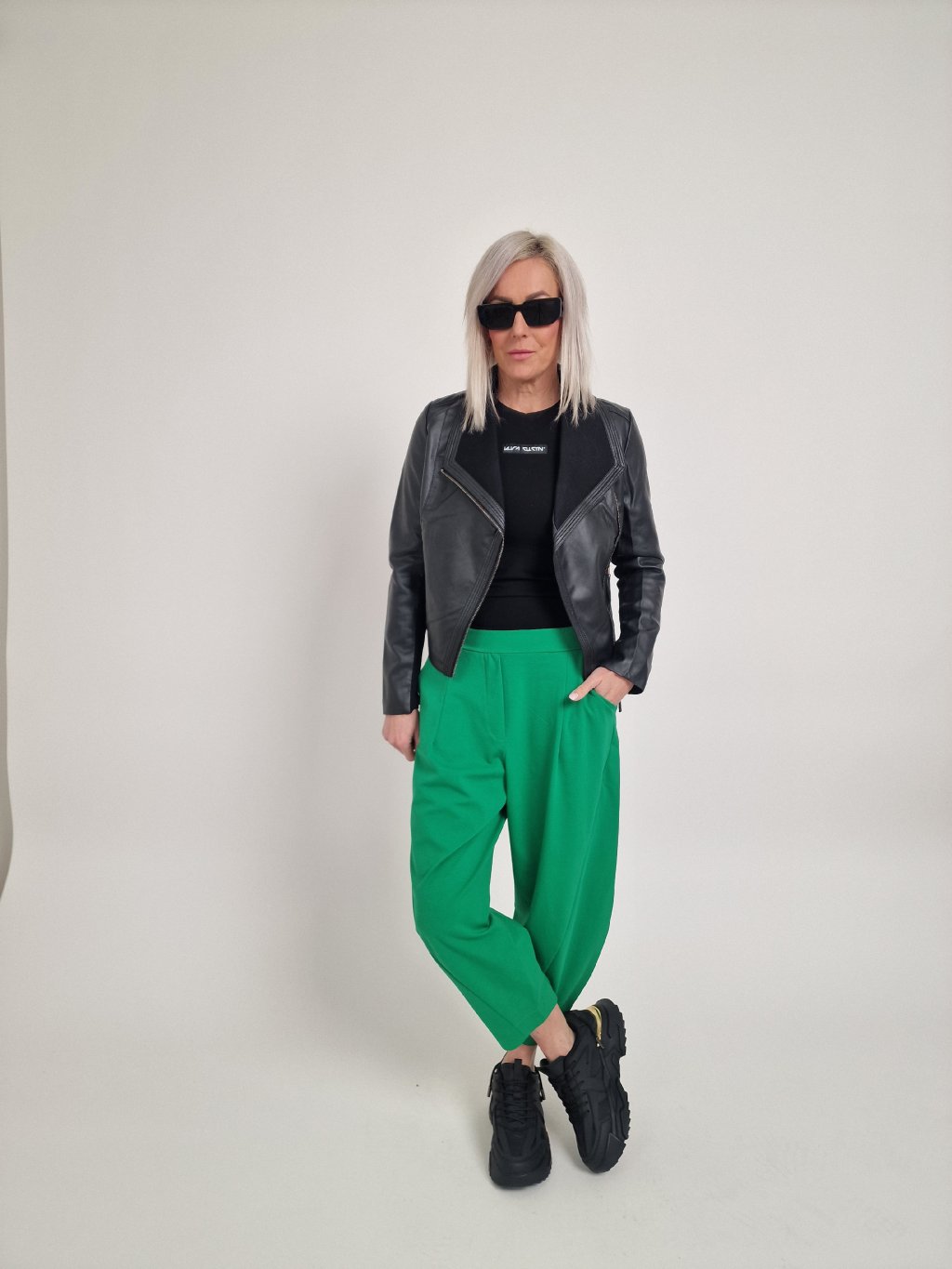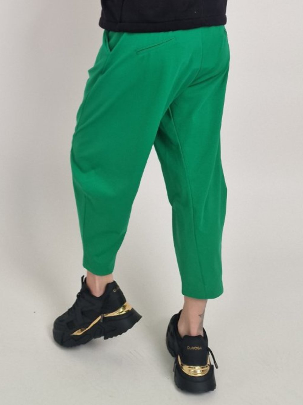 Luxusní kalhoty s gumou v pase, širšími nohavicemi v horní části, dolu se zužujícími. Super střih i materiál.