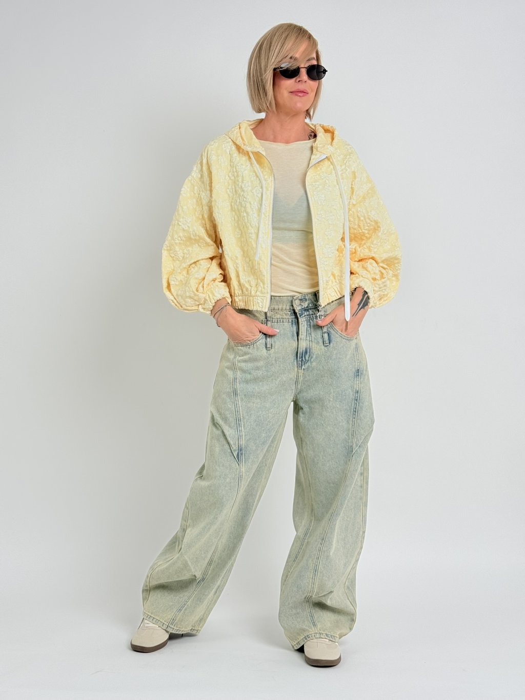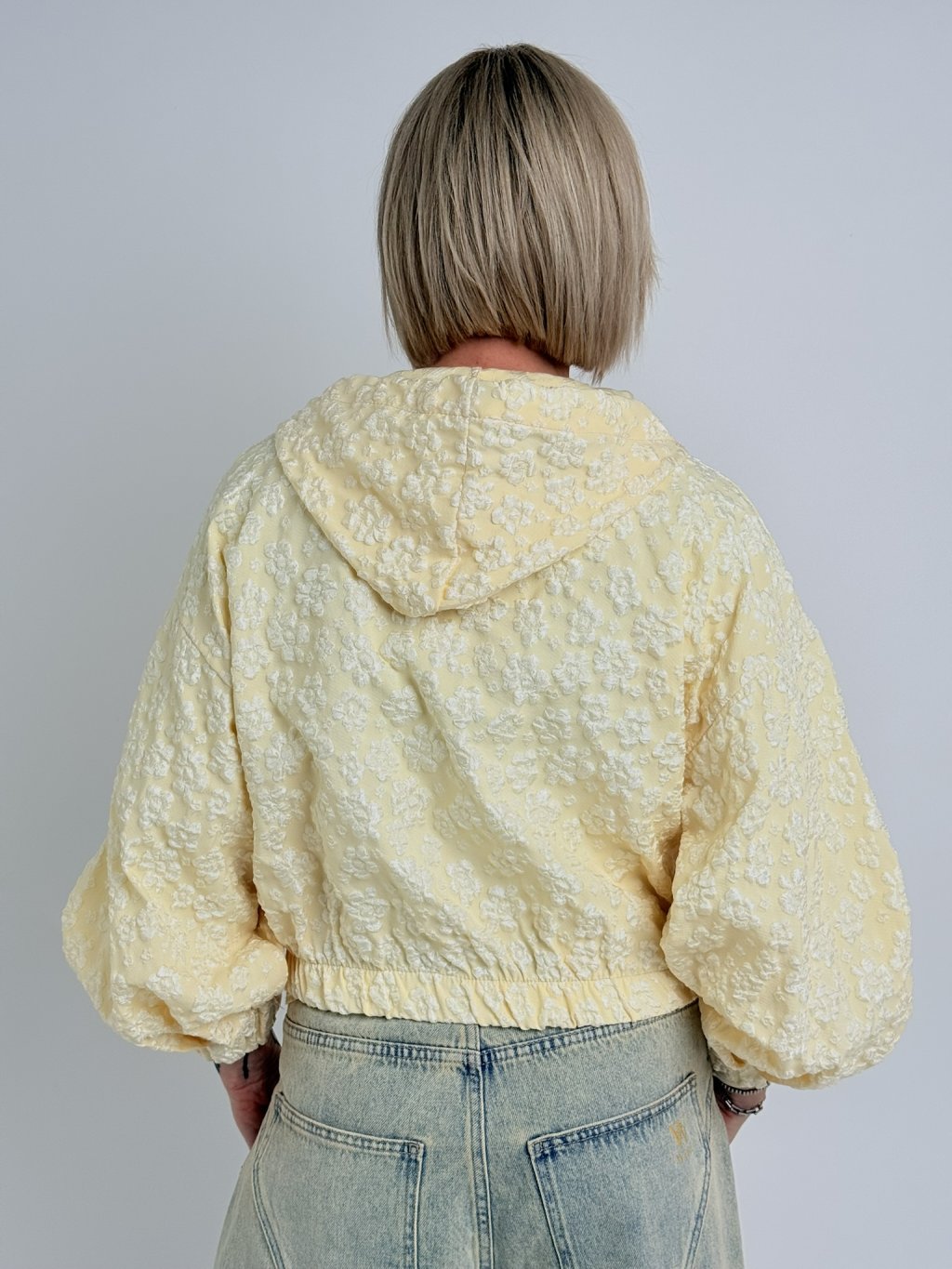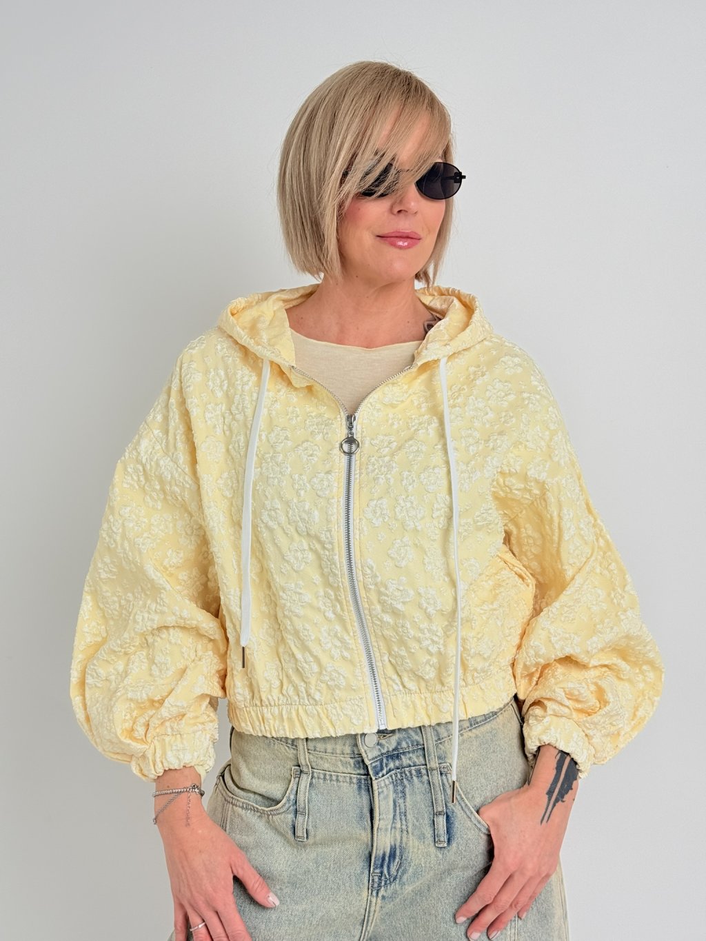 Bundička s plastickým vzorem, kapucí, zapínáním na zip a gumou na konci rukávů i dolní části. Vpředu jsou kapsy.