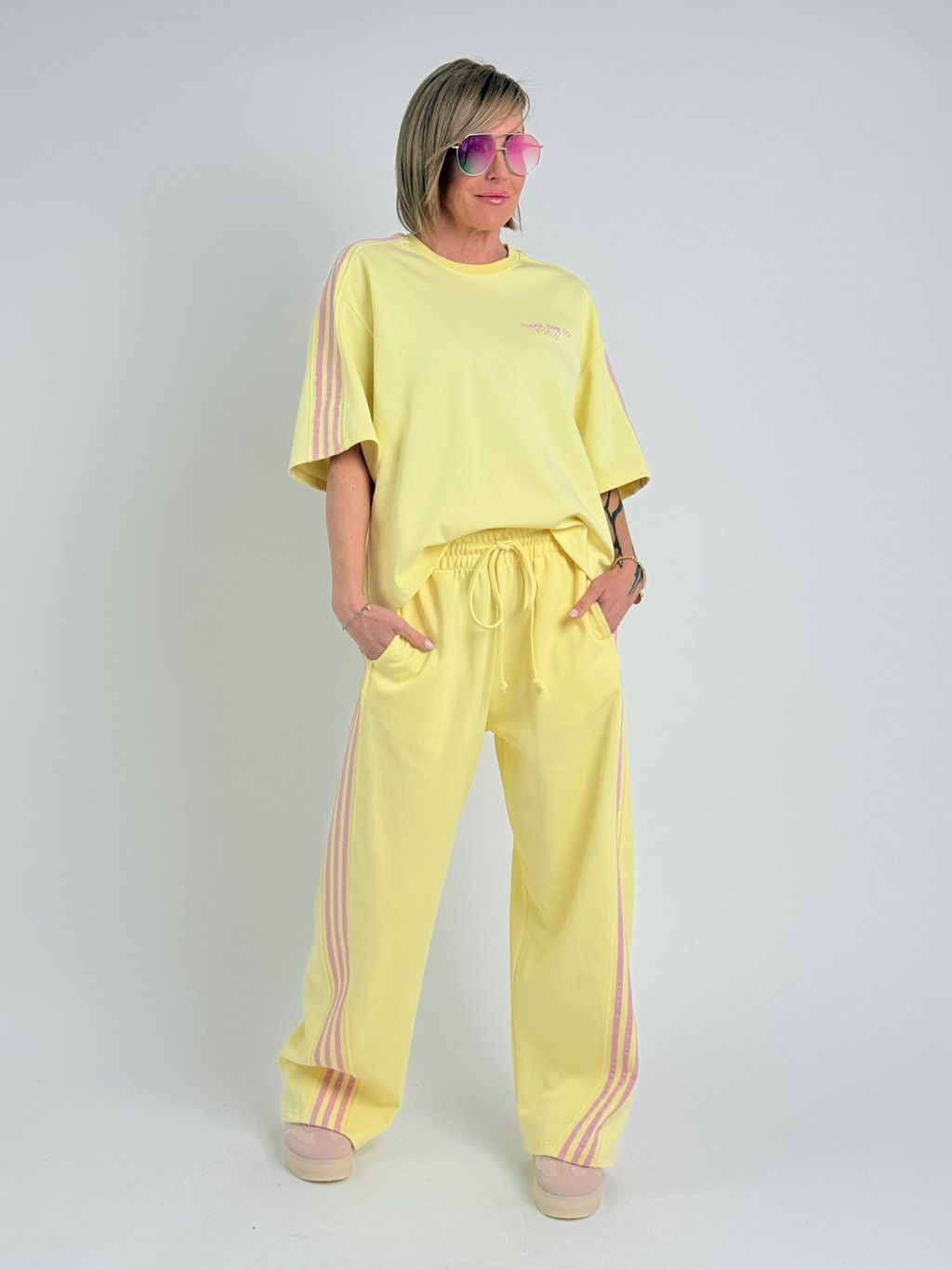 Volnější triko s kulatým výstřihem, krátkým rukávem se třemi proužky a na předním i zadním dílu s růžovými nápisy.